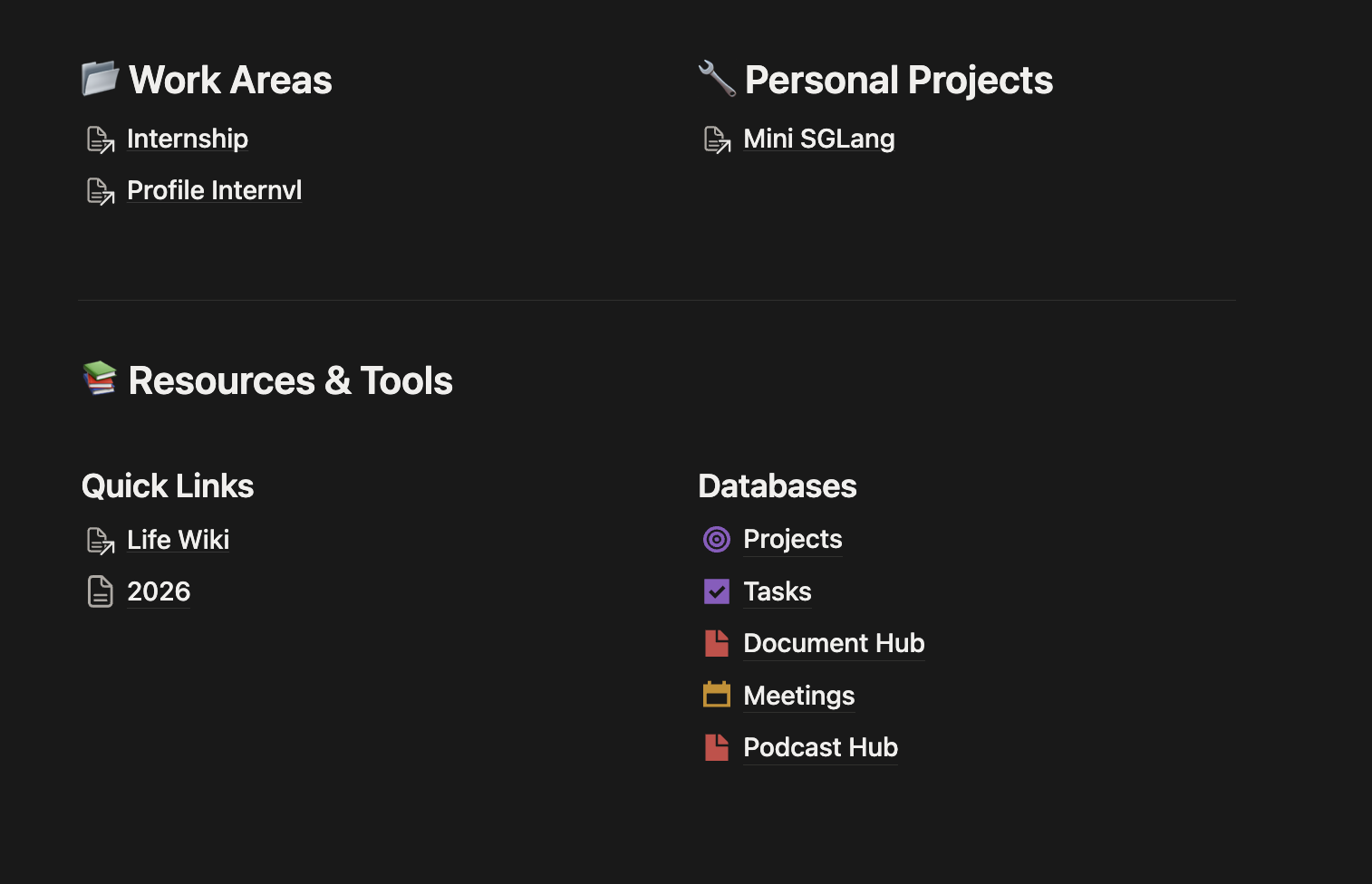 Document Hub — Notes, guides, and reference materials (like this one). I put all my document in one database and categorize them by topic, so as tasks and projects